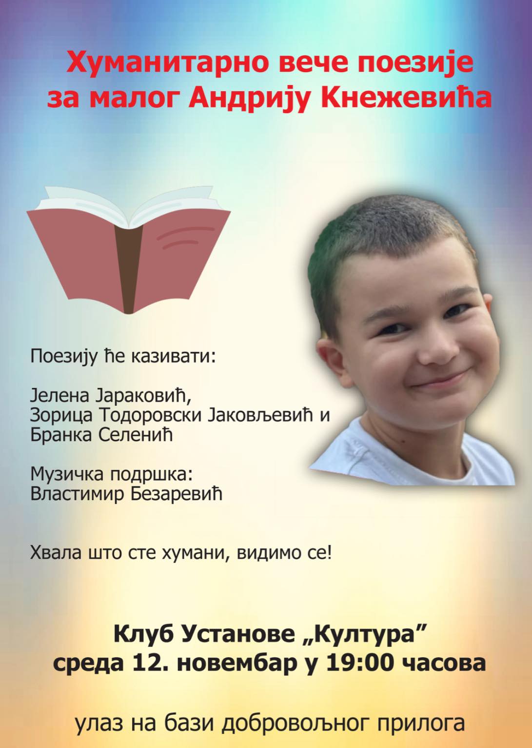 У среду, 12. новембра 2025. године са почетком у 19.00 у Клубу установе Култура одржаће се хуманитарно вече поезије „ХУМАНИТАРНО ВЕЧЕ ПОЕЗИЈЕ ЗА АНДРИЈУ КНЕЖЕВИЋА“.