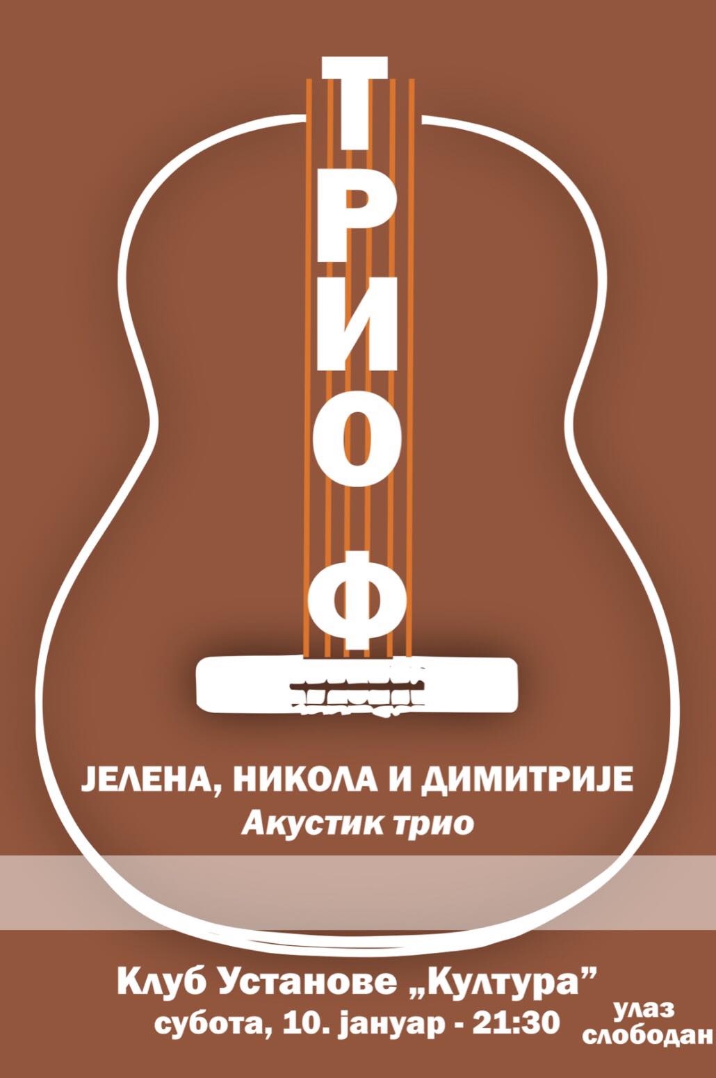 У суботу, 10. јануара 2026. године одржаће се концерт групе „ТРИО Ф“ у клубу Установе „Култура“.