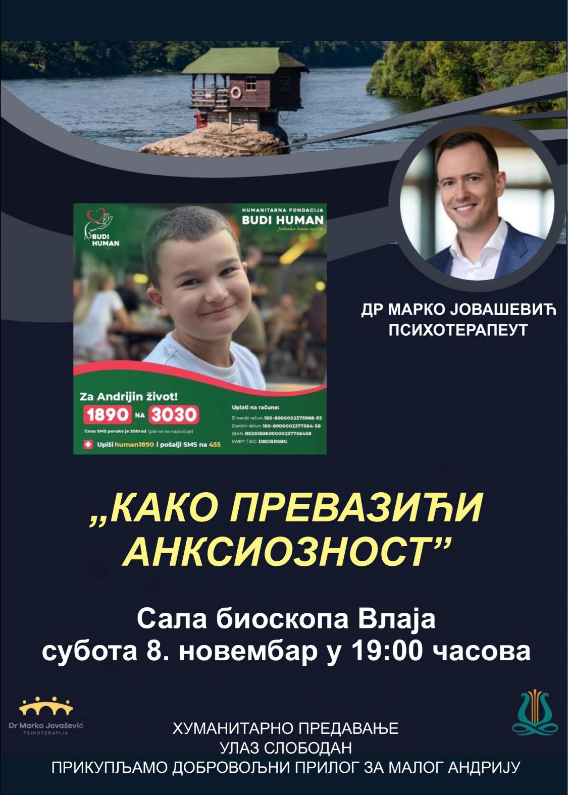 У суботу, 7. новембра 2025. године са почетком у 19.00 у сали биоскопа „Влаја“ одржаће се хуманитарно предавање психотерапеута др Марка Јовашевића на тему „КАКО ПРЕВАЗИЋИ АНКСИОЗНОСТ“.