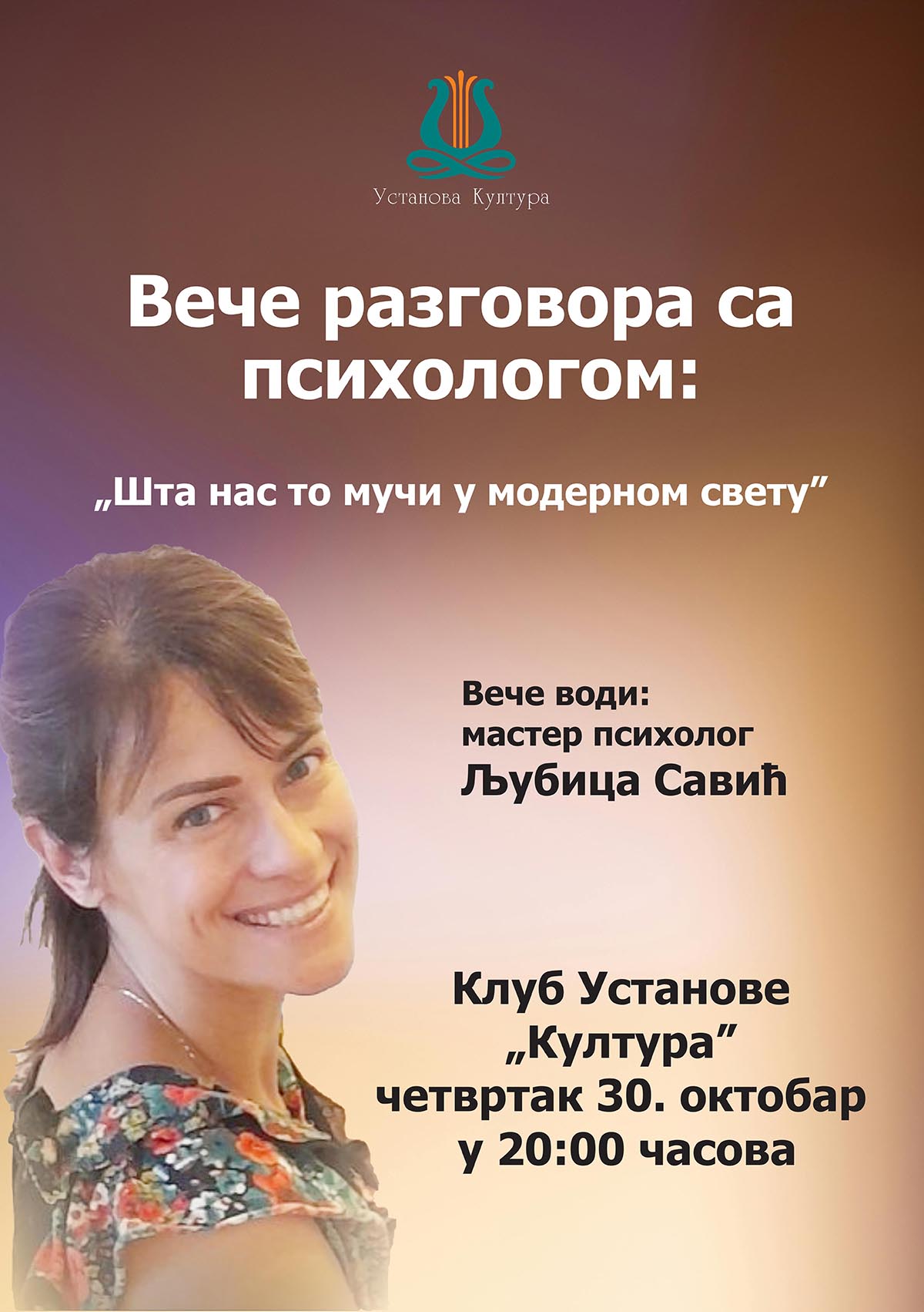 У четвртак, 30. новембра 2025. године са почетком у 20.00 у Клубу установе Култура одржаће се вече са псхилогом на тему „ШТА НАС ТО МУЧИ У МОДЕРНОМ СВЕТУ“.